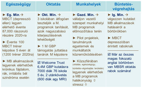 2015-ben az Egyesült Királyság / Nagy-Britannia törvényhozásának „Mindfulness Összpárti Parlamenti Munkacsoportja” (Mindfulness All-Party Parliamentary Group - MAAPG) szakértõk meghívásával zajló parlamenti meghallgatások valamint parlamenti képviselõk és szakértõk részvételével zajló 1 évig tartó háttérmunka összefoglalásaképpen egy közel 50 oldalas jelentést (Mindful Nation UK Report) készített a brit kormány és a Parlament számára, melyben konkrét javaslatokat fogalmaztak meg a mindfulness módszerek társadalomban történõ elterjesztésére vonatkozóan. A jelentés 4 területet jelöl meg, ahol a mindfulness módszerek elterjesztése kívánatos lenne, mely az egész társadalom számára pozitív eredményeket hozna: